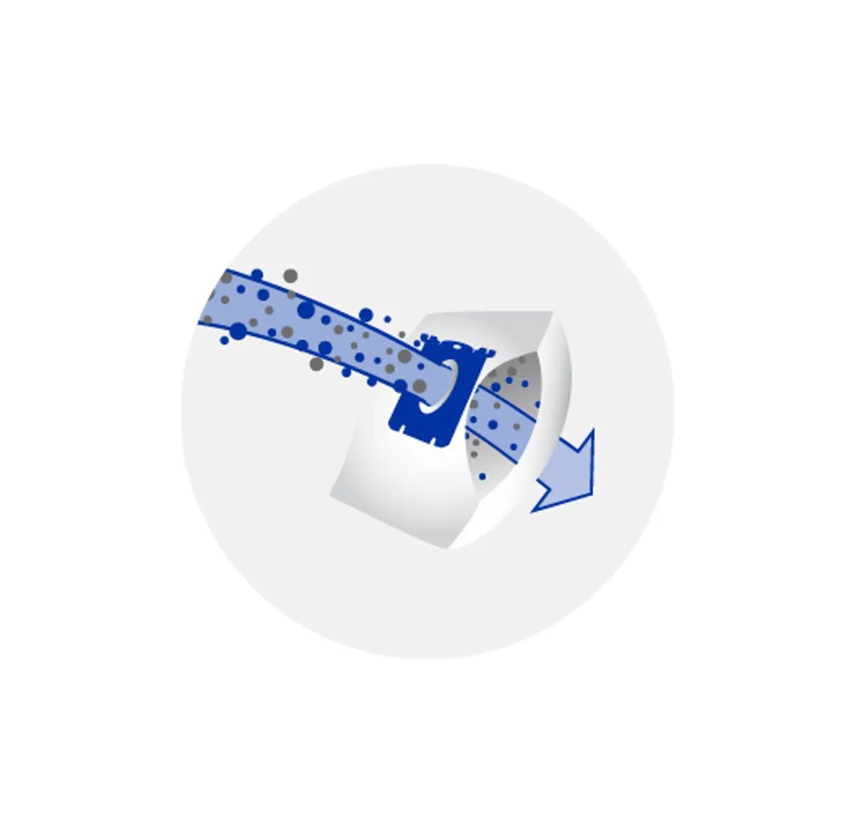 Takket være en banebrydende teknologi og teknik, forhindrer den dårlig lugt i dit hjem under og efter rengøring. Det giver en længere brugstid og bidrager til at holde en høj sugeeffekt, indtil støvsugerposen er fuld. Materialet DURAFLOW™ Fresh garanterer et højt filtreringsniveau og sikrer et sundere indeklima.